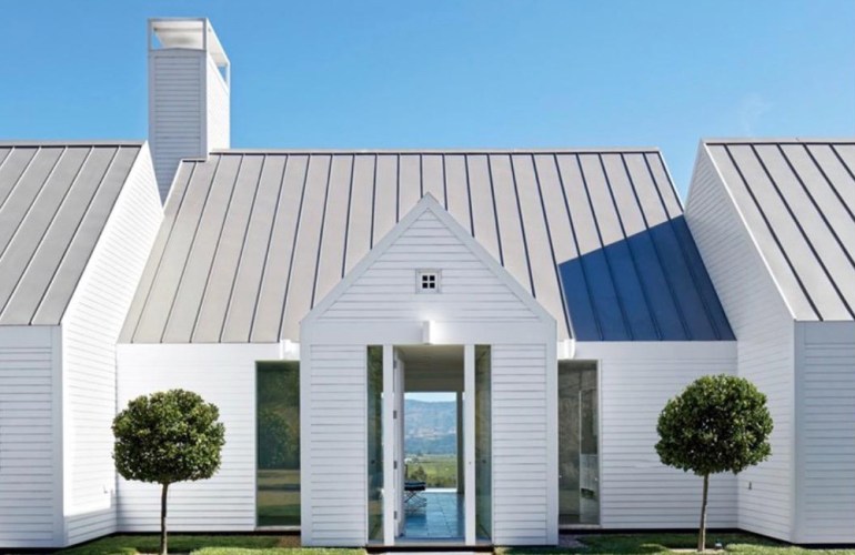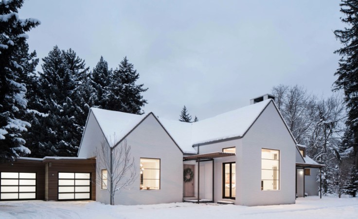 Modern Farmhouse will also commonly employ wood as the siding material, and sometimes even the roof, as shown above. I suppose this makes sense since farmhouses were traditionally built from wood. But in the modern interpretation the wood is often left unpainted, or is even reclaimed wood from some deconstructed barn for instance. If the wood is installed as a “rain screen” with an air gap behind it then the resulting air flow on both sides of the wood helps keep it dry and prevents rot. The air flow also helps keep a house cool in the summer.