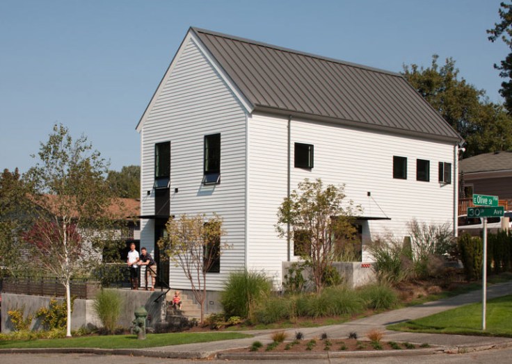 Doing some reading about farmhouses I learned that when an old farmhouse was first built, the farmer would usually start with a simple structure to house the family and make some room for cooking. As time went by, and over generations, additions were added to the original structure. Wings if you will. This concept is given a modern interpretation in the home shown above where it looks like a “box” was tacked on to the side of the original home. Also note the Corten steel used to frame the planters (retaining walls).