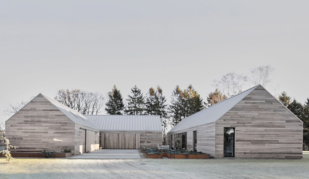 Above is a Modern Farmhouse in Denmark. Clad in light colored wood. Steep gable roof design with no overhangs, standing seam. Designed as an “assemblage” of structures with a courtyard.
