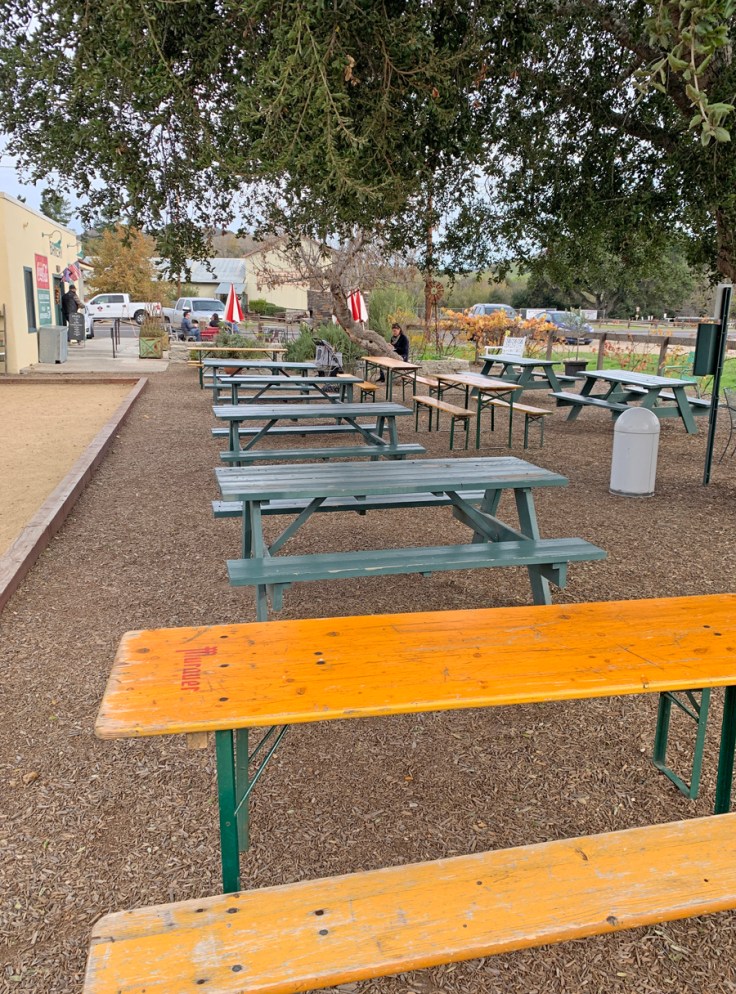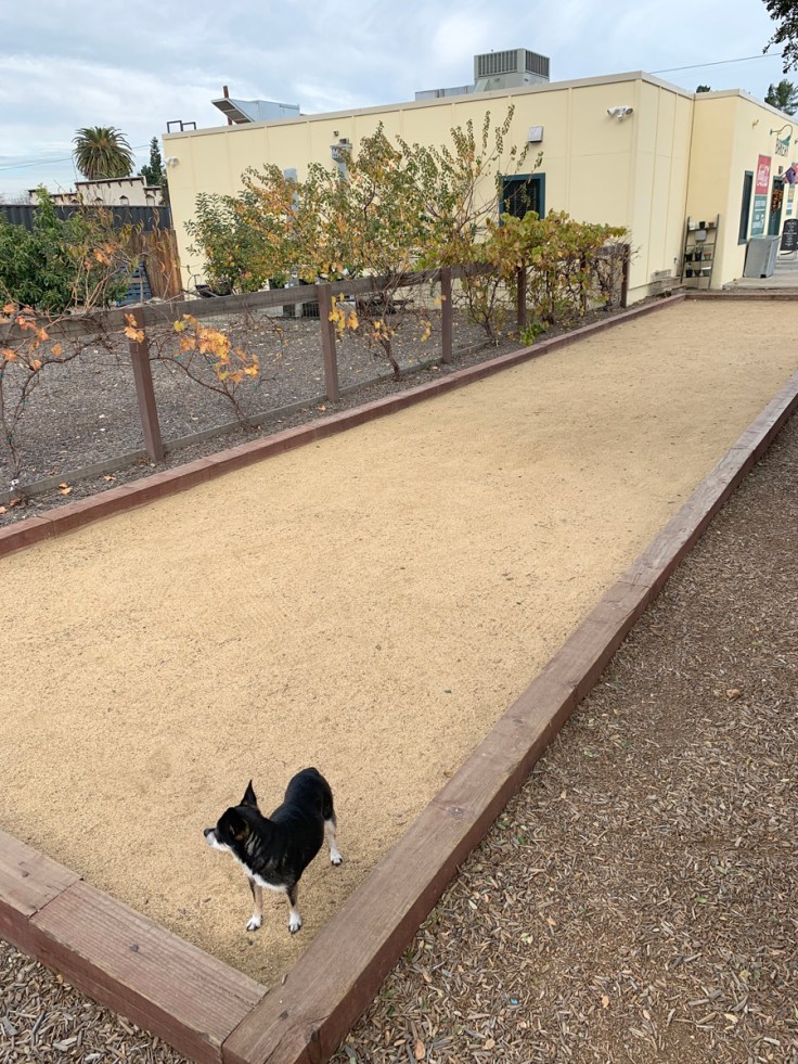 Since the weather is usually very nice in this temperate climate zone, Bob has created a great outdoor seating area complete with picnic benches and authentic Parisian style outdoor tables and chairs. It’s a good thing too, since on a crowded day you can barely get through the front door! The outdoor space is dog friendly, so we always bring Rico and Junior along.