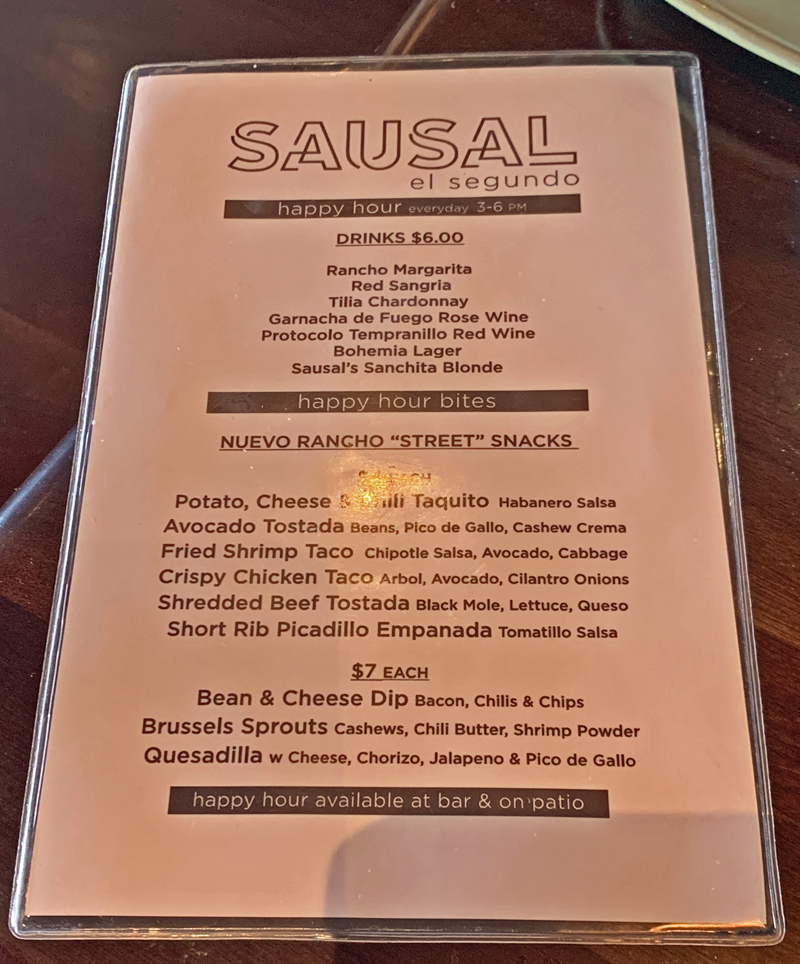 Guess where we usually sit? That’s right city-slickers, at the bar. On our most recent visit, we had just finished clearing the last of our stuff out of our old home in El Segundo, then found we were quite hungry, so looked at the time, and “Hey, guess what? It’s Happy Hour at Sausal!” Off we went.