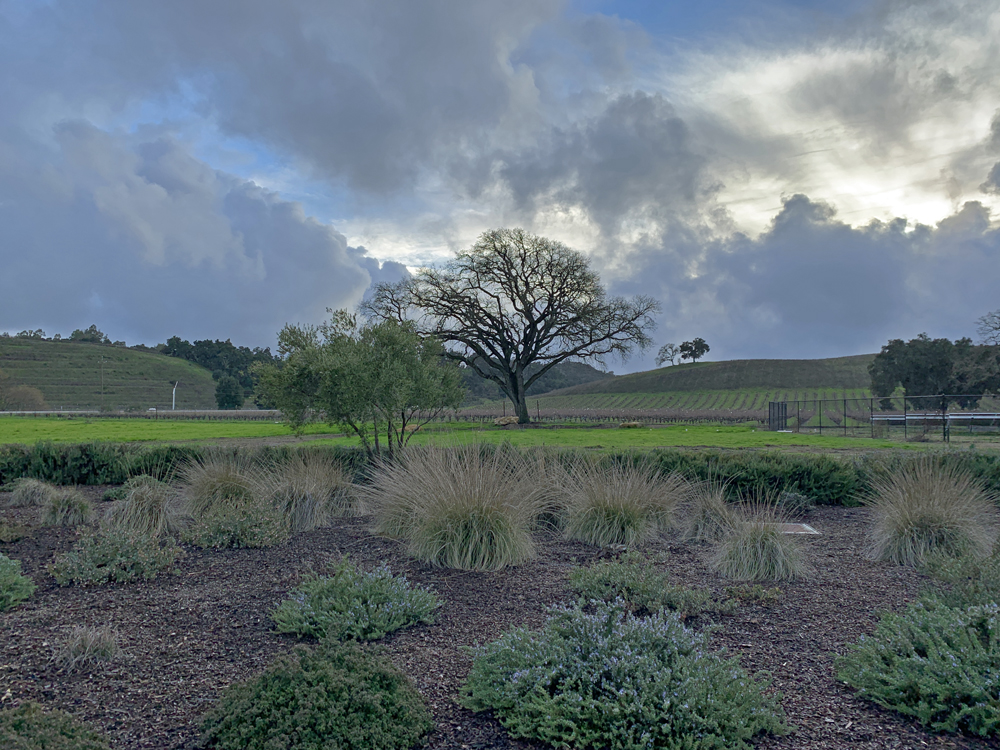 We bellied up to the tasting bar, with Rico kicking back in his dog stroller. We ordered three tastings. On the first sample the young lady mentioned that the grapes had been grown on “Heart Hill”. Intrigued, I asked what that was. She said “turn around”. Whoa, yes, there it was, plain as day. On the hill outside the tasting room, in the middle of a vineyard, was a cluster of Oak trees which perfectly formed the outline of a heart.