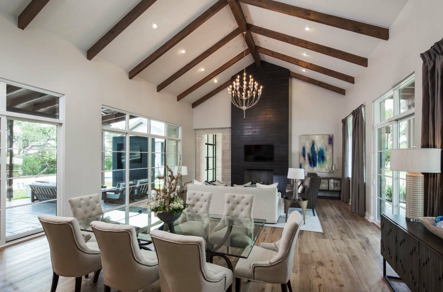 The first space is small scale, the second is large scale. But wait, really? We’re now in sort of a grey area. Neither of these rooms reads as particularly large, or particularly small. They are in between, or maybe they incorporate elements of both philosophies? The first picture shows a living/dining area with relatively tall ceilings. This allows for large windows to take in the Napa vineyard views. But the unfinished wood ceiling and beams give a sense of warmth, so that the space is still cozy. The second picture shows a dining room in Austin, which is actually quite small in floor area. But a sense of grandeur is created by the tall ceiling height (relative to the size of the room).